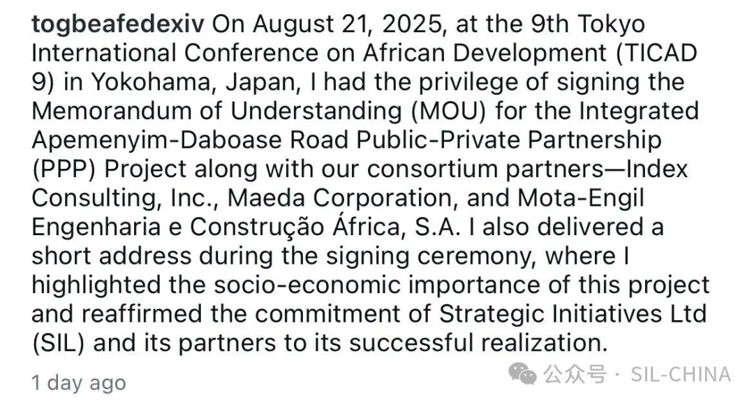 托比国王与其联合体合作伙伴 -- Index 咨询株式会社、前田建设工业株式会社,及Mota-Engil 非洲工程建筑股份有限公司,共同荣签位于加纳的 Apemenyim-Daboase 综合公路 PPP(政府与社会融资项目合作)项目谅解备忘录(MOU)。